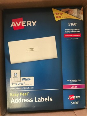 Avery 5160 return address labels 1 inch by 2⅝ inches, 30 labels per sheet.